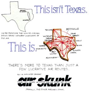 At first, AirSkunk "existed" as an imaginary intrastate carrier. It arguably might have been the first (imaginary or otherwise) to recognize an upside afforded by the business model of a very young Southwest Airlines: while Southwest was focused on the lucrative Dallas-Houston-San Antonio markets, AirSkunk would answer by heading to places where other airlines couldn't set down. With the slogan There's more to Texas than just a few lucrative air routes, "service" was initiated to places like Tolar, Negley, Study Butte, Agua Nueva, Whiteflat, and Fabens, from a central "hub" in Pottsville, Texas. Never mind that Pottsville didn't actually have an airport, we just adopted the closest actual airport in Hamilton, a few miles down the road.
